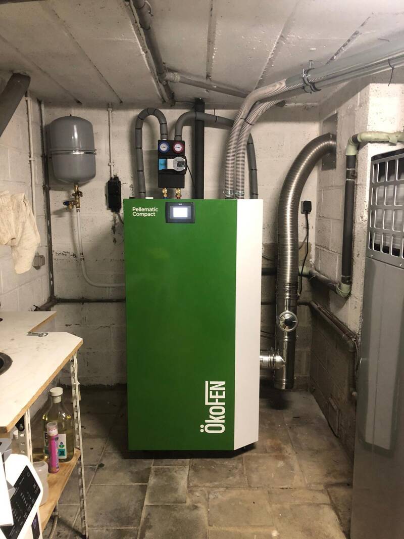 Oplossing - Een pelletketel van ÖkoFEN (Pellematic Compact), met eigen silo en vacuümpompsysteem. De silo werd gedimensioneerd op 1x jaar te moeten laten inblazen door een vrachtwagen met pellets. De ketel werkt modulerend met buitenvoeler. Een deel van de garage (1,8x2,3m) werd hiervoor vrijgemaakt. Er werd gekozen voor één van de beste systemen op de markt, ÖkoFEN - Oostenrijkse topkwaliteit, 155.000 systemen geïnstalleerd, lokale dienstverlening én met een verwachte levensduur van zeker 25 jaar.